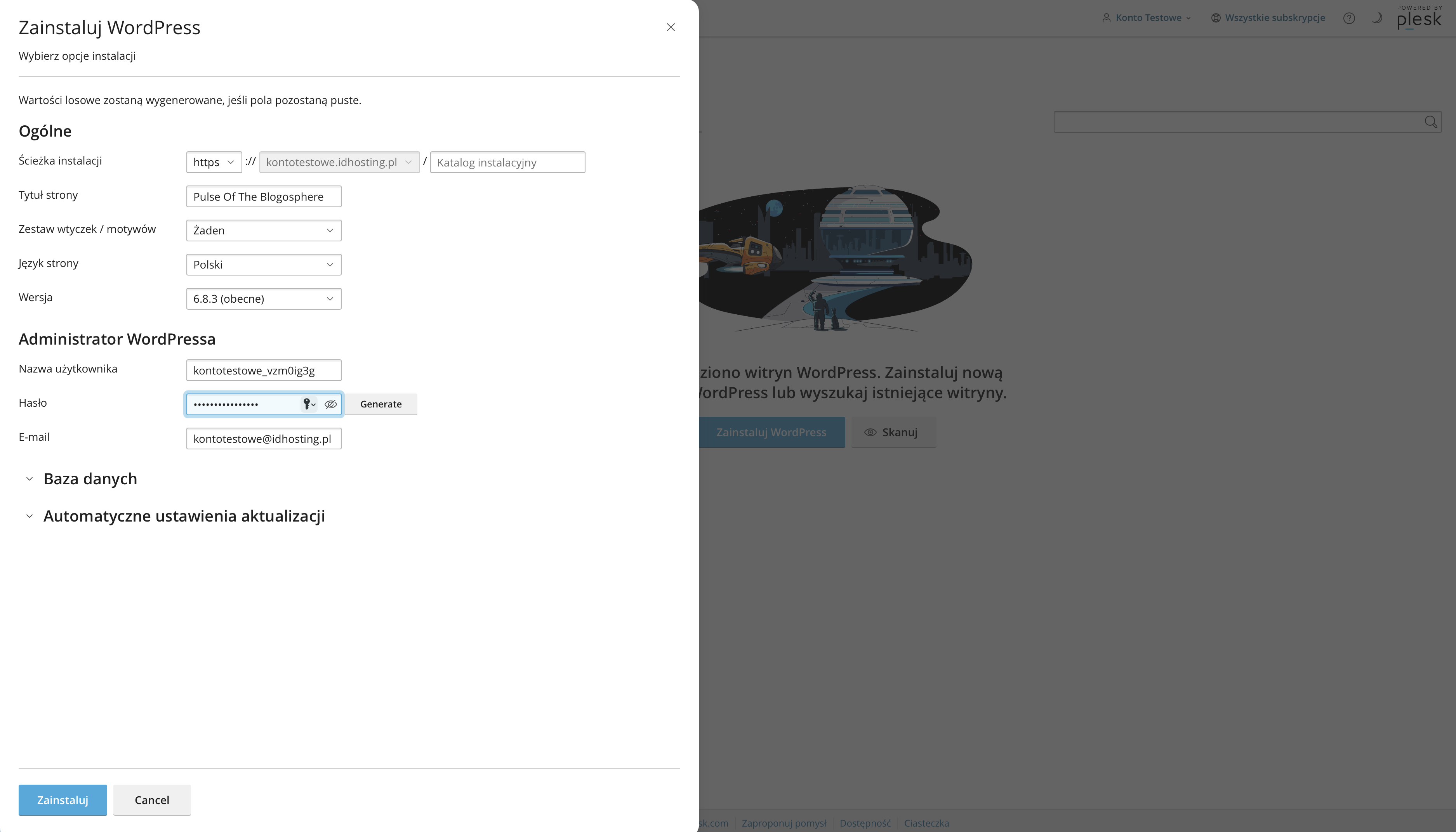 System w tle tworzy katalog instalacyjny na serwerze, zakłada bazę danych i użytkownika, kopiuje pliki WordPressa, a następnie łączy wszystko w spójną konfigurację.