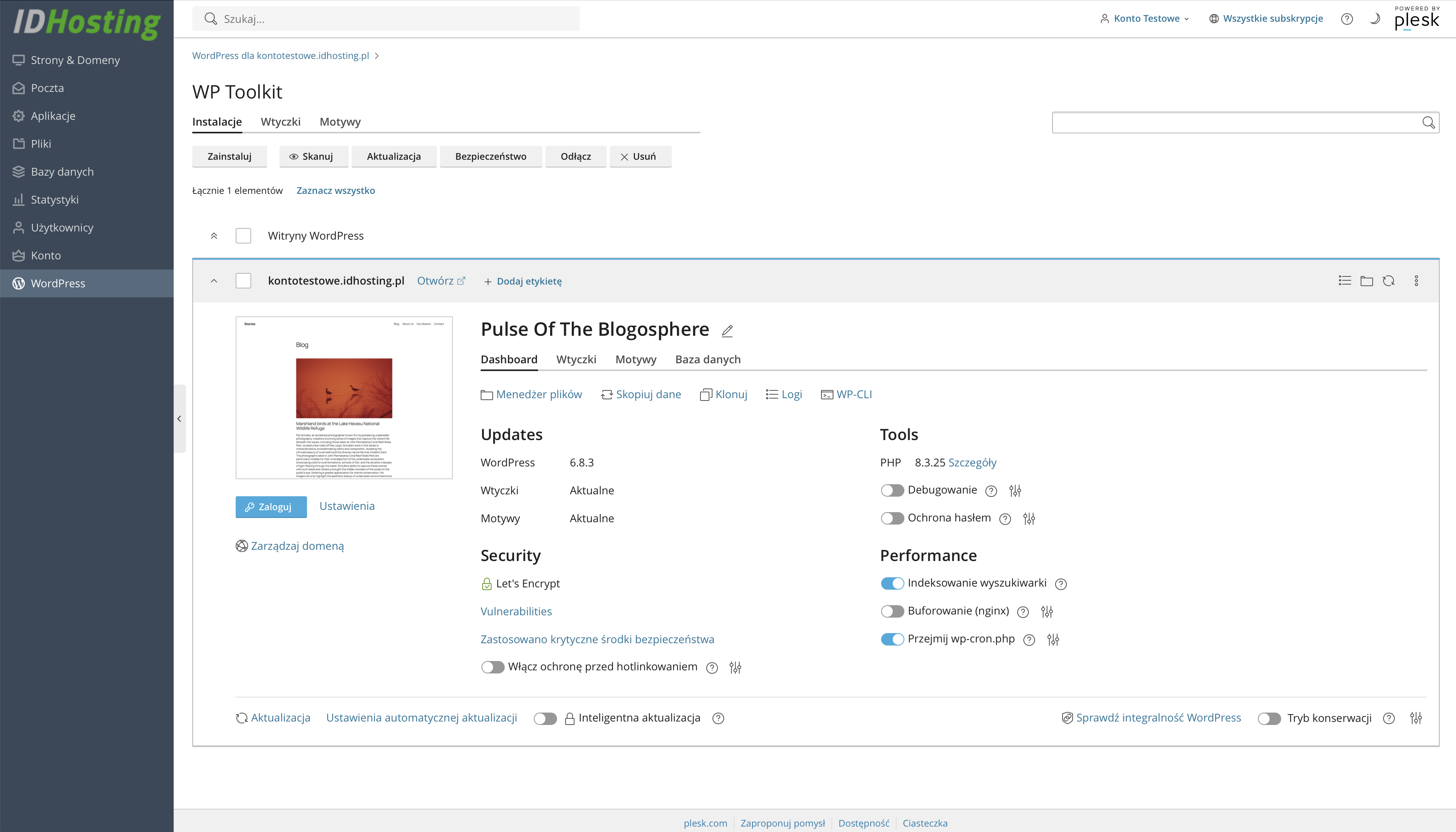 WordPress Toolkit w panelu Plesk to kompleksowe narzędzie do zarządzania wszystkimi instalacjami WordPress w jednym miejscu. Niezależnie od tego, czy prowadzisz jedną stronę, czy kilkanaście witryn klientów - WordPress Toolkit pozwala Ci łatwo instalować, aktualizować, testować i zabezpieczać każdą z nich. Poniżej znajdziesz przegląd najważniejszych funkcji zilustrowanych na przykładach z panelu Plesk.